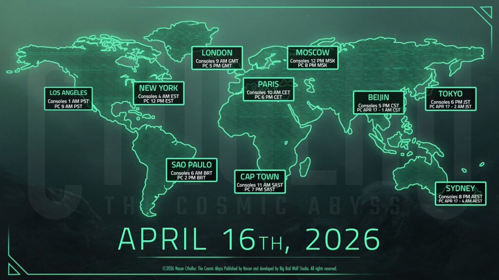 Cthulhu: The Cosmic Abyss, do estúdio NACON, foi lançado no dia 16 de abril de 2026 e chegará para os consoles de nova geração, estando disponível para PlayStation 5Xbox Series X|S e PC.
